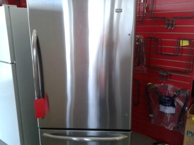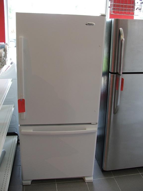 Refurbished Amana refrigerator. Bottom freezer, 30 inches wide, 66 1/2 inches high, 30 inches deep.