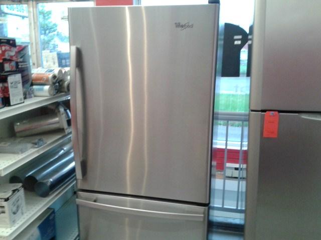 Refurbished Whirlpool refrigerator; 66 inches high, 29 inches wide, and 30 inches deep. Bottom freezer.